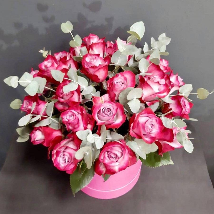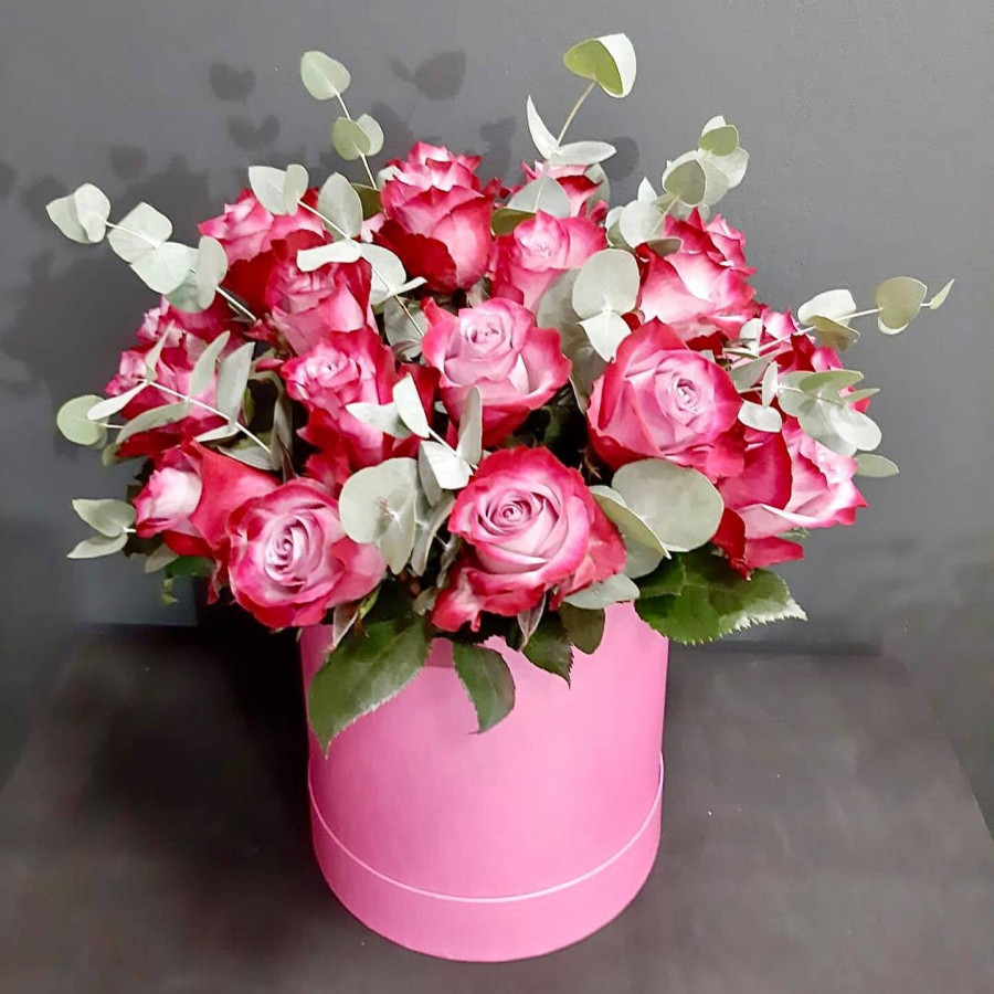 На фото 21 розовая роза в шляпной коробке. В составе: роза 21 шт, эвкалипт 4 шт, шляпная коробка (m) 1 шт, . Все цветы свежие и ароматные, букет красиво оформлен и отлично подходит для подарка. Доступна доставка цветов или самовывоз.