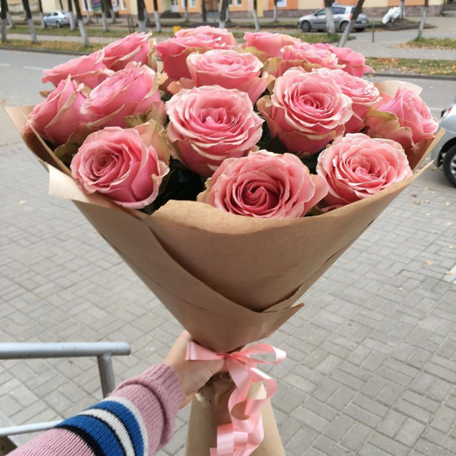 На фото букет из 17 розовых роз. В составе: роза 17 шт, крафт-бумага 1 шт, атласная лента 1 шт, . Все цветы свежие и ароматные, букет красиво оформлен и отлично подходит для подарка. Доступна доставка цветов или самовывоз.
