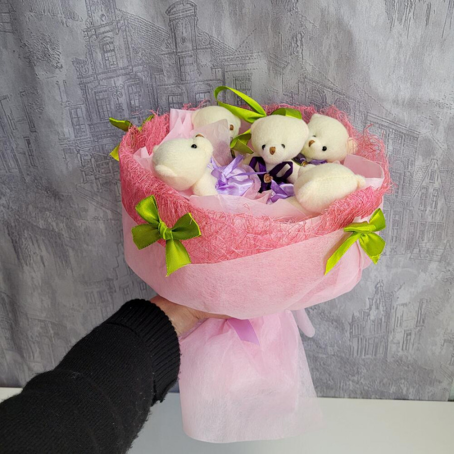 На фото букет из игрушек мишки 5 шт. В составе: . Все цветы свежие и ароматные, букет красиво оформлен и отлично подходит для подарка. Доступна доставка цветов или самовывоз.