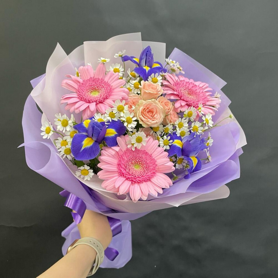 На фото букет «лиловый конфетти». В составе: ирис 3 шт, кустовая роза 1 шт, танацетум 3 шт, гербера 3 шт, дизайнерская упаковка 1 шт, атласная лента 1 шт, . Все цветы свежие и ароматные, букет красиво оформлен и отлично подходит для подарка. Доступна доставка цветов или самовывоз.