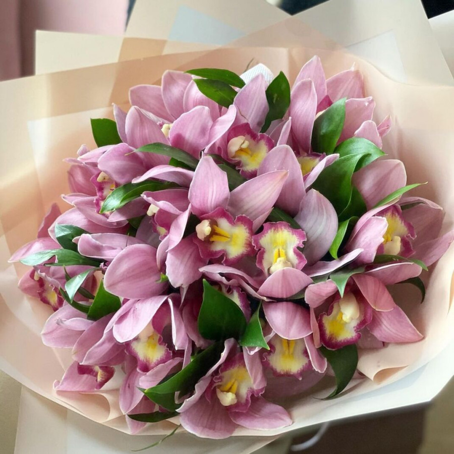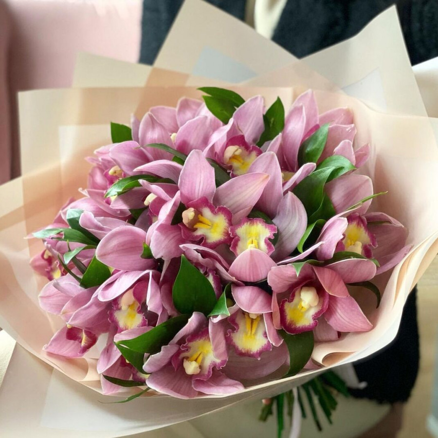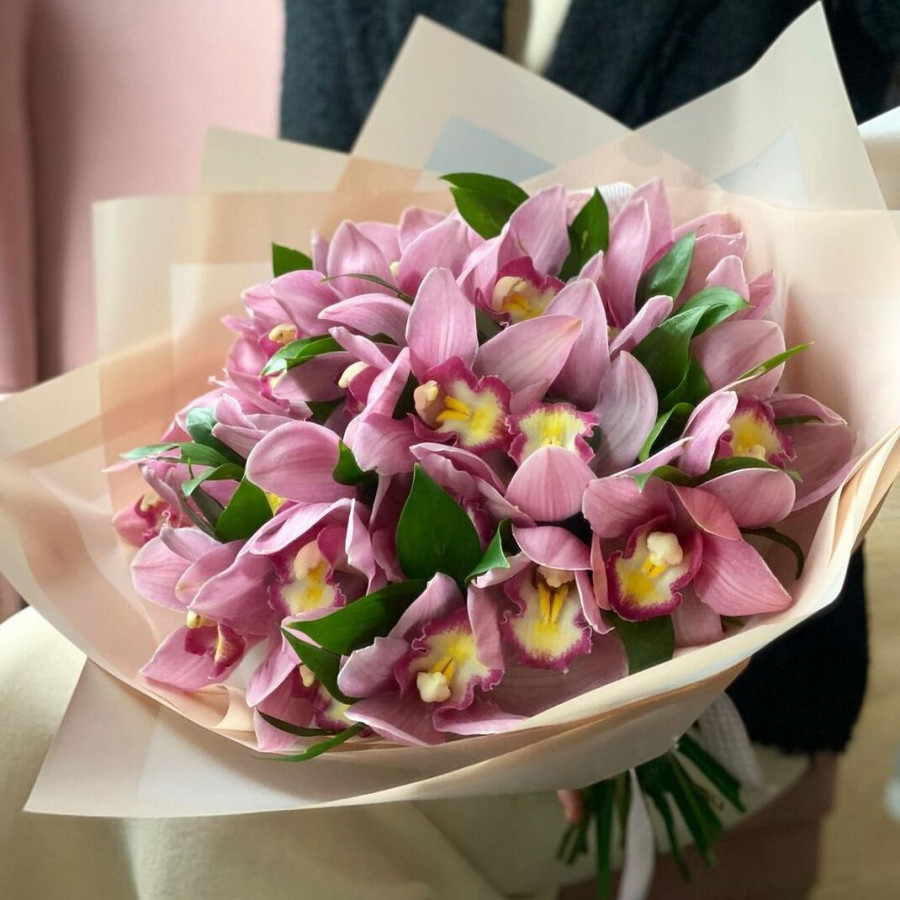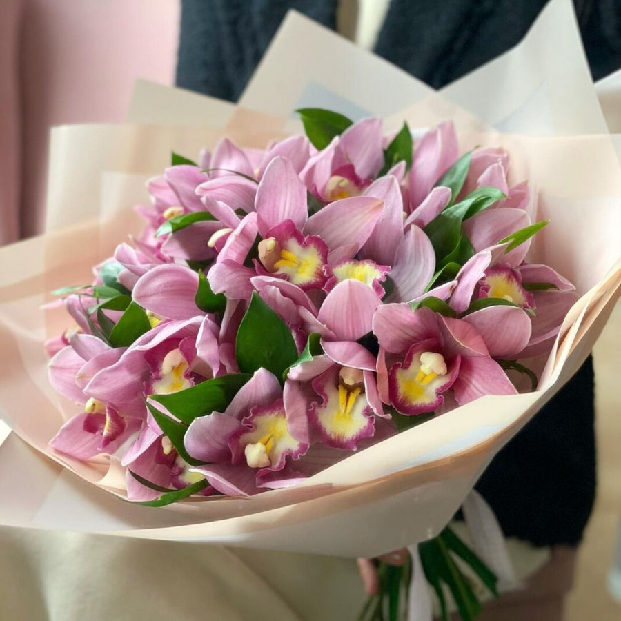 На фото букет с розовой орхидеей. В составе: орхидея 17 шт, аспидистра 4 шт, крафт-бумага 1 шт, вибирнум 1 шт, . Все цветы свежие и ароматные, букет красиво оформлен и отлично подходит для подарка. Доступна доставка цветов или самовывоз.