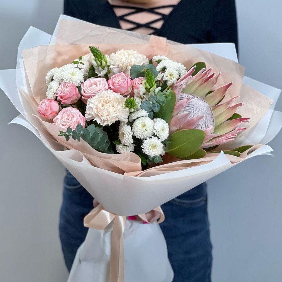 На фото экзотический букет с протеей. В составе: протея 1 шт, хризантема кустовая 3 шт, кустовая роза 2 шт, эвкалипт 3 шт, гвоздика 2 шт, крафт-бумага 1 шт, атласная лента 1 шт, . Все цветы свежие и ароматные, букет красиво оформлен и отлично подходит для подарка. Доступна доставка цветов или самовывоз.